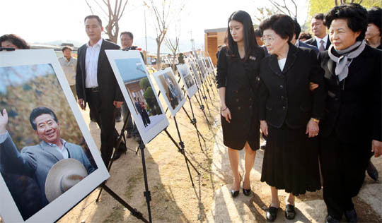 고(故) 김대중 전 대통령의 부인 이희호 여사가 21일 오후 경남 김해 봉하마을을 처음으로 방문해 권양숙 여사의 안내로 고 노무현 전 대통령의 모습이 담긴 사진을 둘러보고 있다.