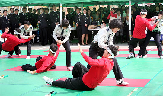 21일 전북경찰청에서 열린 제64회 경찰의 날 기념식에 경찰들이 체포술 시범을 선보이고 있다.