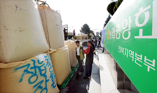 한국농업경영인 전라북도 연합회 회원들이 21일 농협중앙회 전북지역본부앞에서 수확기 쌀값 보장 촉구를 위한 벼 야적투쟁 기자회견을 마치고 벼를 농협본부 앞에 쌓고 있다.