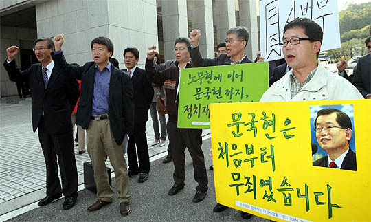 대법원 전원합의체가 비례대표 후보 추천을 대가로 공천헌금을 받은 혐의로 기소된 창조한국당 문국현 대표에게 당선무효형에 해당하는 징역 8월에 집행유예 2년을 선고한 가운데 22일 오후 서초동 대법원 앞에서 방청을 마치고 나온 창조한국당 당원들이 기자회견을 하고 있다.