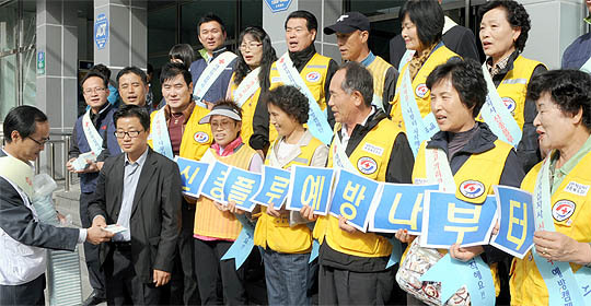 대한적십자사 전북지사 봉사원과 직원 20여명과 한국야쿠르트 전주영업소 직원들이 22일 전주 시외버스터미널앞에서 시민들에게 신종플루 예방캠페인을 벌이고 있다.