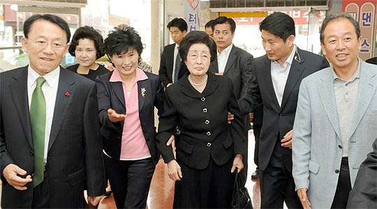고 김대중 전 대통령의 부인인 이희호 여사가 22일 전주 가족회관을 찾아 김완주지사와 임정엽군수와 함께 들어서고 있다.