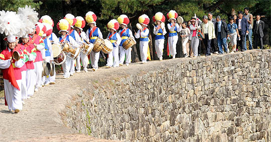 제36회 고창모양성제 행사가 25일 고창읍성에서 열려 고창여고 얼쑤 풍물패들을 선두로 시민들이 답성놀이를 하고 있다.