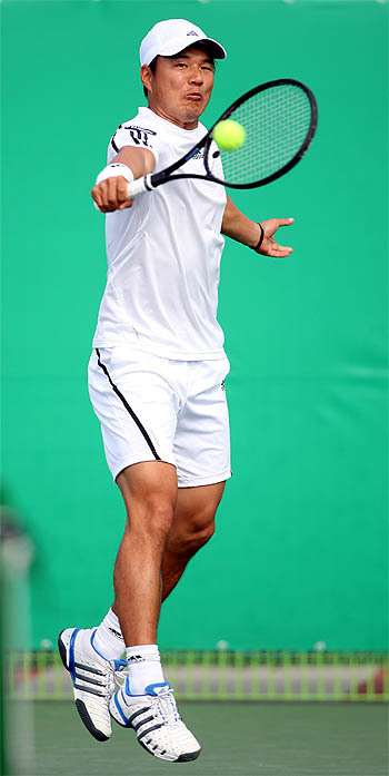 은퇴를 앞둔 한국테니스의 간판스타 이형택이 25일 대전 충남대 문화테니스장에서 열린 제90회 전국체전 테니스 남자일반 단체전 결승 부산-경기전에서 경기 김영준에게 점프하며 백핸드 스트로크를 날리고 있다.