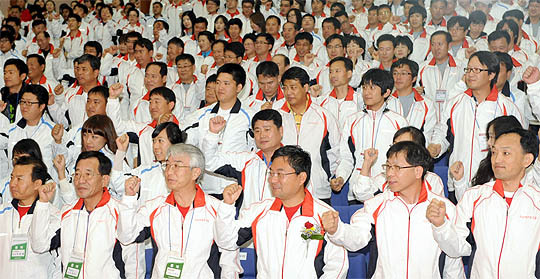 23일 전북도청 대강당에서 열린 이스타항공 한마음대회에서 이상직회장과 임직원들이 파이팅을 하고 있다.
