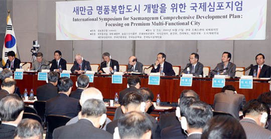 27일 국토연구원 주관으로 서울 프레스센터에서 열린 새만금 명품복합도시 개발을 위한 국제 심포지엄에서 참석자들이 종합토론을 하고 있다.