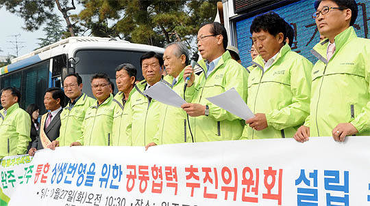 27일 완주·전주 통합 민간추진협의회원들이 완주군청 앞에서 전주·완주 통합 상생 번영을 위한 공동협력 추진위원회 설치를 위한 기자회견을 하고 있다.