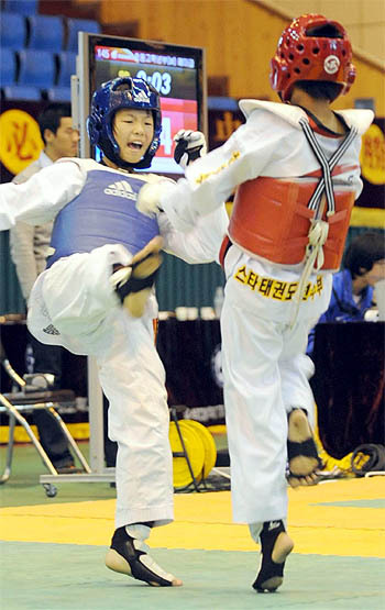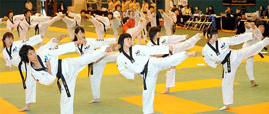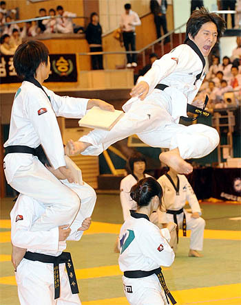'2009 전북일보배 태권도대회'에서 우석대학교 태권도학과 시범단이 공연을 펼치고 있다.