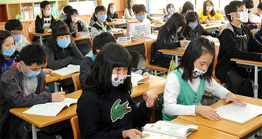신종플루 확산이 더욱 빨라지고 있는 가운데 지난 30일 전주 양지초등학교 학생들이 마스크를 쓴 채 수업하고 있다.