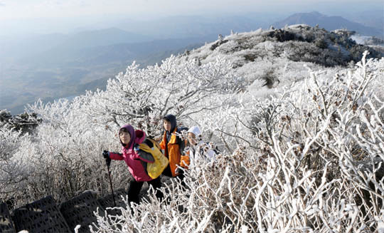 올들어 가장 추운 날씨를 보인 2일 전북 무주군 덕유산 향적봉에서 등산객들이 하얀 눈꽃이 핀길을 걷고 있다.