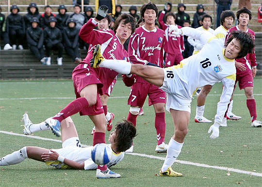 2일 전주대에서 열린 U리그 4강전에 홈팀 전주대와 전년도 초대 챔피언이었던 경희대의 경기에 전주대 16번 김영권 선수와 경희대 5번 김진환 선수가 치열하게 볼다툼을 하고 있다. 이날 경기는 승부차기 끝에 전주대가 경희대를 3-2로 누르고 결승에 진출했다.
