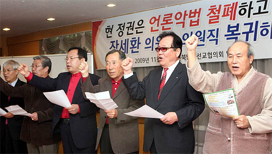 전북인권선교협의회가 2일 민주당 전주 완산을 지역위사무소에서 기자회견을 갖고 헌법재판소의 국회 미디어법 판결에 항의해 사표를 낸 장세환 국회의원의 복귀를 촉구했다.