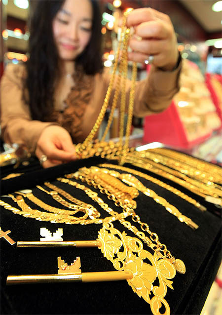 4일 서울 종로 한 귀금속 매장에서 직원이 순금제품을 들어 보이고 있다. 이날 국제 금값은 온스당 1,085.07달러까지 치솟으며 사상 최고치를 경신했다.