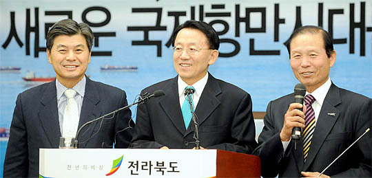 3일 전북도청 브리핑룸에서 김완주 지사와, 문동신 군산시장, 이춘희 새만금 군산경제자유구역청장이 새만금 신항 건설계획이 정부의 예비타당성 조사를 통과함에 따라 2010년 용역을 거쳐 2011년 착공할 계획이라는 기자회견을 하고 있다.