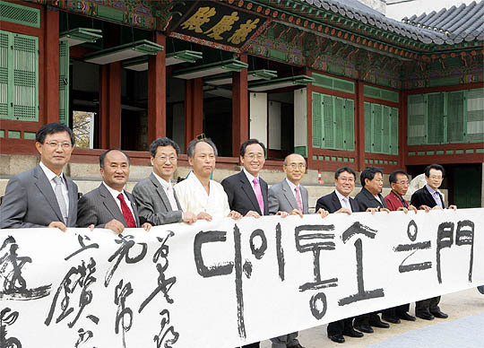 5일 서울 경복궁 자경전에서 열린 조선시대 왕실 진상품인 전주한지를 사용한 '경복궁 자경전 한지 바르기 재현행사'에서 송하진 전주시장 등 참석자들이 기념촬영을 하고 있다.
