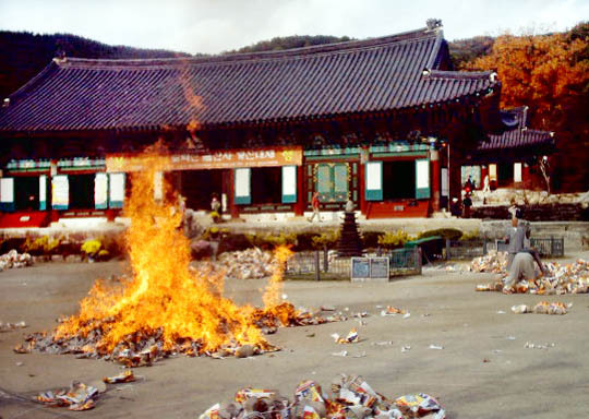 지난 7일 오후 3시께 금산사 미륵전 앞 마당에서 승려들이 연등과 채광모자 등을 모아 소각하고 있다.