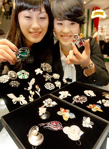 17일 롯데백화점전주점에서 고객들이 겨울철 코트나 재킷에 자신만의 스타일을 더해줄 수 있는 브로치를 살펴보고 있다.