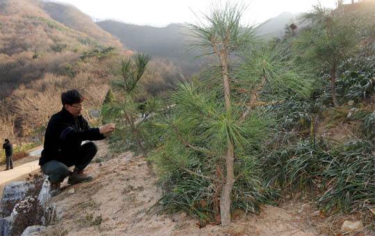 17일 완주 대아수목원에서 전라북도 산림연구소 박지원 녹지연구사가 천연기념물 제355호인 곰솔 후계목을 살피고 있다.