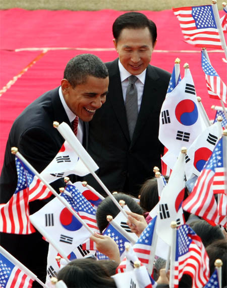 이명박 대통령과 버락 오바마 미국 대통령이 19일 오전 청와대에서 열린 공식환영식에서 태극기와 성조기를 흔들며 환영하는 어린이들과 인사하고 있다.