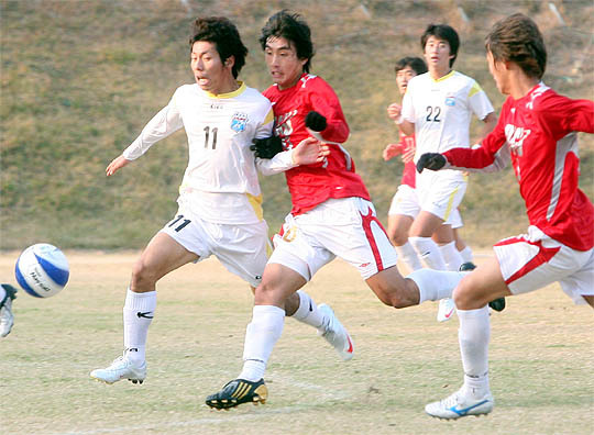 전주대와 단국대의 '2009대학축구협회 U리그' 결승전이 19일 전주대에서 열린 가운데 전주대 11번 이병호 선수가 단국대 수비수들을 돌파하고 있다. 이날 경기는 0-0 무승부로 끝나 오는 26일 단국대학교 천안캠퍼스에서 다시 맞붙게 됐다.