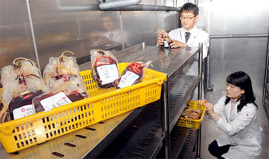 동절기를 맞아 혈액 수급에 비상이 걸리면서 전북적십자사 혈액원 직원들이 혈액 보관 창고에서 혈액 재고량을 조사하고 있다.
