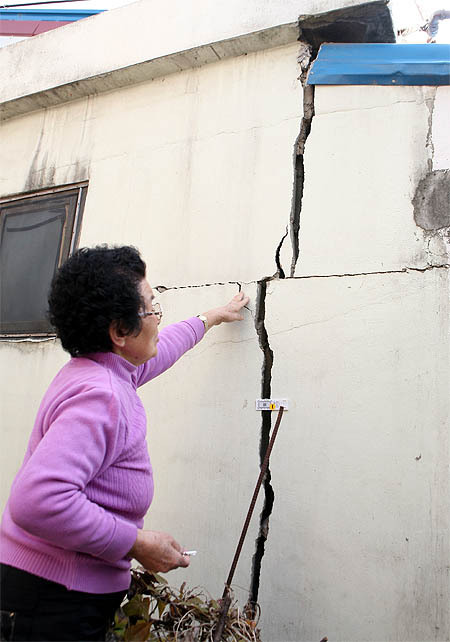 '풍년맨션 재난예방 사업' 석축 공사로 벽에 금이 간 곳을 한 주민이 자세히 살펴보고 있다.