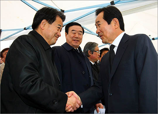 정세균 민주당 대표와 무소속 정동영 의원이 故 김대중 전 대통령 서거 100일을 맞이해 25일 오전 국립서울현충원 고인의 묘역에서 열린 추모 기도회에서 만나 악수하고 있다.
