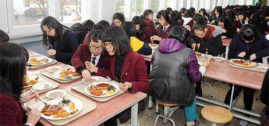 25일 전주중앙여고 학생들이 비좁은 급식소에서 빼곡히 앉아 점심을 먹고 있다.