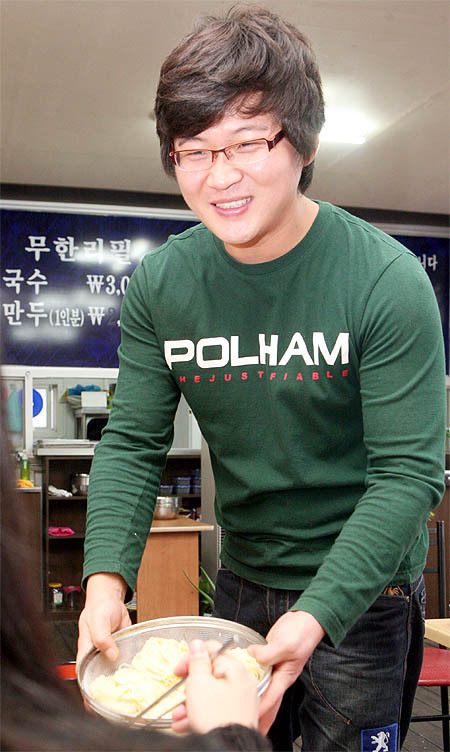 주부클럽연합회 전주·전북지회로부터 착한가게 6호점에 선정된 전주시 서신동의 '사방팔방국수' 이제은 사장이 손님들에게 국수를 리필해주고 있다.