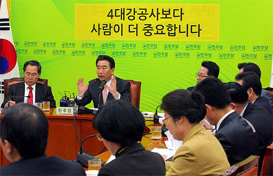 민주당 이강래 원내대표가 26일 국회에서 열린 고위정책회의에서 새해 예산안 심의와 노사정 6자회의 결렬 등 현안에 대해 발언하고 있다.