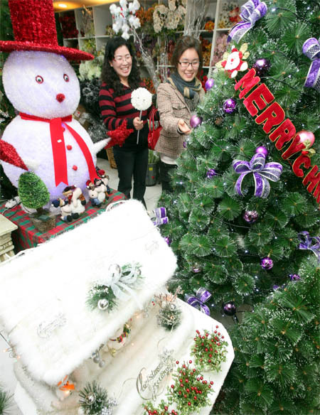 크리스마스를 한달 여 앞둔 29일 전주의 한 조명상점에서 고객들이 크리스마스트리와 장식물들을 고르고 있다.