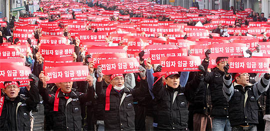 28일 전주 코아백화점 앞에서 한노총 전북지부 산하 노조원 1200여명이 노동탄압 분쇄 노동자대회를 갖고 정부의 노조전임자 임금지급 금지 철회 등을 촉구했다.