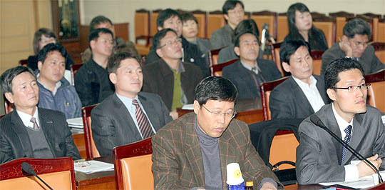 30일 전북도청에서 열린 새만금 저탄소 녹색성장 시범지역 조성방안 최종보고회 및 공청회에 참석자들이 새만금 연계 국가철도 도입방안 등에 관한 제안을 듣고 있다.