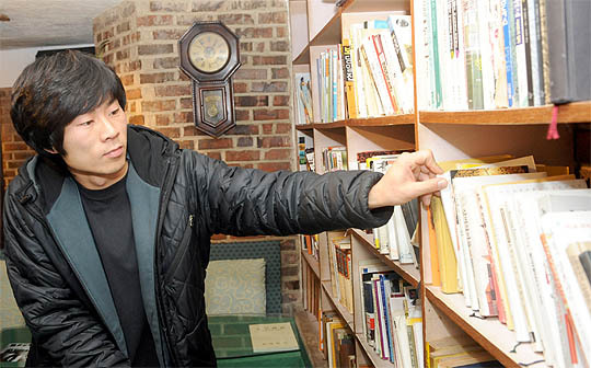전주시 고사동 카페 '빈센트'의 젊은 주인 서보성씨가 벽면의 책장을 정리하고 있다. 서씨는 손님들이 이 곳에서 읽고 싶은 책을 아예 가져가고, 대신 다른 책 한 권을 꽂아두도록 할 생각이다. 1980년대의 모습을 고스란히 간직한 이 카페는 올해로 개점 30주년을 맞았다.