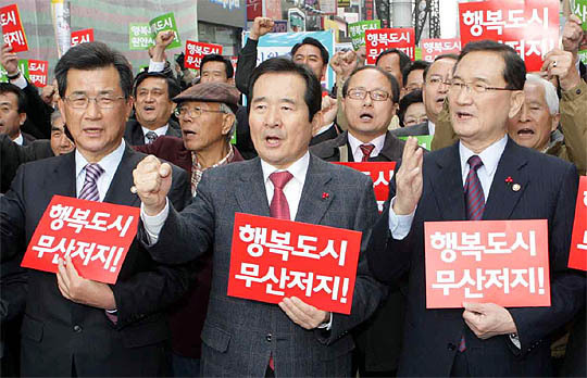 민주당 정세균 대표(가운데)가 1일 오후 청주시 성안길에서 열린 세종시 원안사수 국민대회에 참가해 원안 사수를 촉구하는 구호를 외치고 있다.