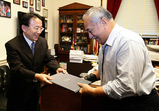 2일 김완주 지사를 비롯한 새만금 투자유치단이 미 하원 아태소위원장 애니 팔레오마베가에게 오바마 대통령에게 전달할 건의문을 전달하고 있다. 건의문은 글로벌 새만금의 투자유치를 비롯한 전라북도 핵심 개발사업의 현황 설명과 군산공항 확장에 관한 건의문등이 담겨있다.