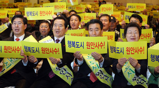 정세균 민주당 대표 등 민주당 관계자들이 3일 오후 충남 천안에서 행정중심복합도시(세종시) 원안사수 총궐기 대회를 열고 행복도시 원안 추진을 요구하고 있다.