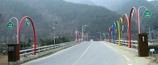 전주에서 상관면을 들어서는 입구인 월암교에는 무지개빛 아치형 조형물이 설치돼 있다. 멀리서 볼 때 파도치는 물결 모양이 생동감 있고 포근하게 느껴지는 이 조형물에는 '나뭇골 상관면'이란 문구가 새겨져 있다.