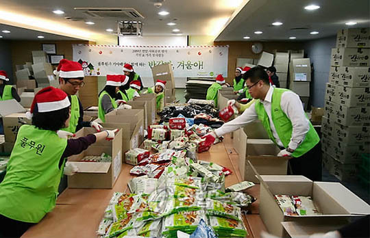풀무원 가족봉사단이 한국국제기아대책기구와 함께 겨울보온용품 및 풀무원 먹거리로 구성된 월동키트를 준비하고 있다.