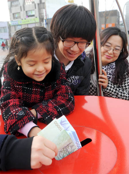전주 오거리문화광장에 등장한 초대형 구세군 자선냄비에 길가던 가족들이 사랑의 모금을 하고 있다.