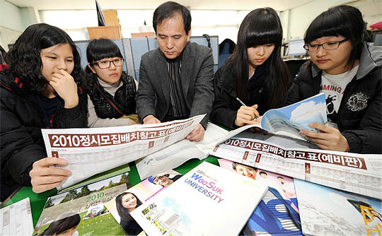 대학수학능력 성적표가 발표되고 수험생들의 진학 상담이 많아지면서 9일 전주여고 진학 상담실에서 교사와 학생들이 2010 정시모집배치표와 대학 입시요강등을 살펴보고 있다.