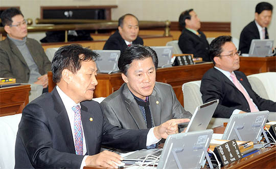 9일 전주시의회 본회의장에서 열린 제267회 전주시의회 제2차 정례회에서 강영수 의원(왼쪽)과 이명연 의원이 대화를 나누고 있다.