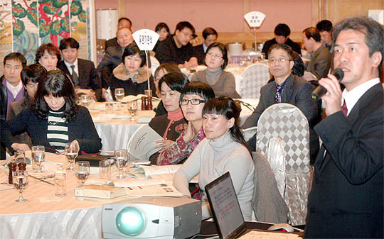 9일 전주 코아리베라호텔에서 열린 '전북의 친환경 섬유산업 현재와 미래' 세미나에서 일본 다이와화학의 토루 오츠키 기술연구소장이 일본 친환경 섬유가공기술 현황에 대해 발표하고 있다.