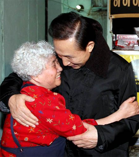 이명박 대통령이 12일 저녁 지난 대선 당시 선거광고에 나왔던 '욕쟁이 할머니' 강종순 씨의 지하 포장마차 식당을 깜짝 방문해, 반갑게 포옹하고 있다.