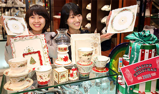 크리스마스를 10일여 앞둔 14일 롯데백화점전주점에서 직원들이 크리스마스 장식이 그려진 접시와 컵 등을 선보이고 있다.