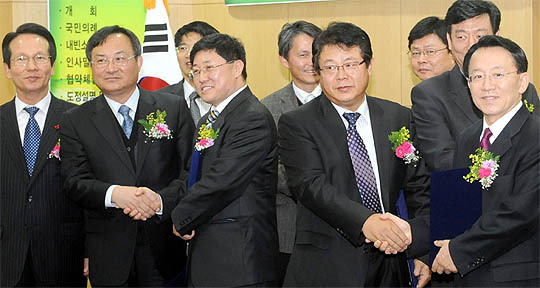 15일 인쇄전자산업 육성을 위한 기술개발투자 MOU 체결식이 전북도청 회의실에서 열려 협약식을 마치고 악수를 하고 있다.