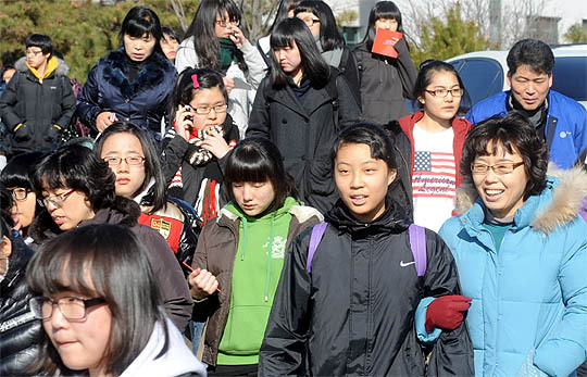 2010학년도 전라북도 평준화지역 일반계고등학교 신입생 선발 시험이 치뤄진 전주 솔내고등학교에서 시험을 마친 수험생과 가족들이 나오고 있다.