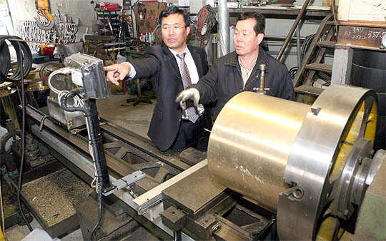 탄소소재를 이용한 이온화식 수 처리기 생산업체인 ㈜이오렉스의 하청공장에서 조태현(왼쪽) 대표와 하청업체 직원이 배관부속품의 가공에 대해 이야기를 나누고 있다.