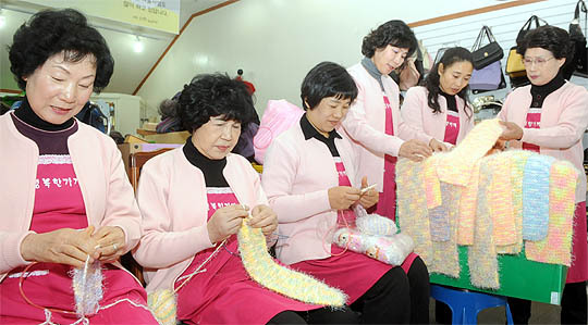 전주 행복한 가게 자원봉사자들이 '사랑의 목도리로 따뜻한 겨울나기' 캠페인을 벌이면서 장애인들에게 전달할 목도리를 만들고 있다.