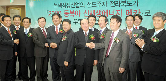 21일 전북도청 종합상황실에서 열린 신재생에너지기업 투자협약 MOU체결식에서 참석자들이 체결식을 마치고 악수를 하고 있다.